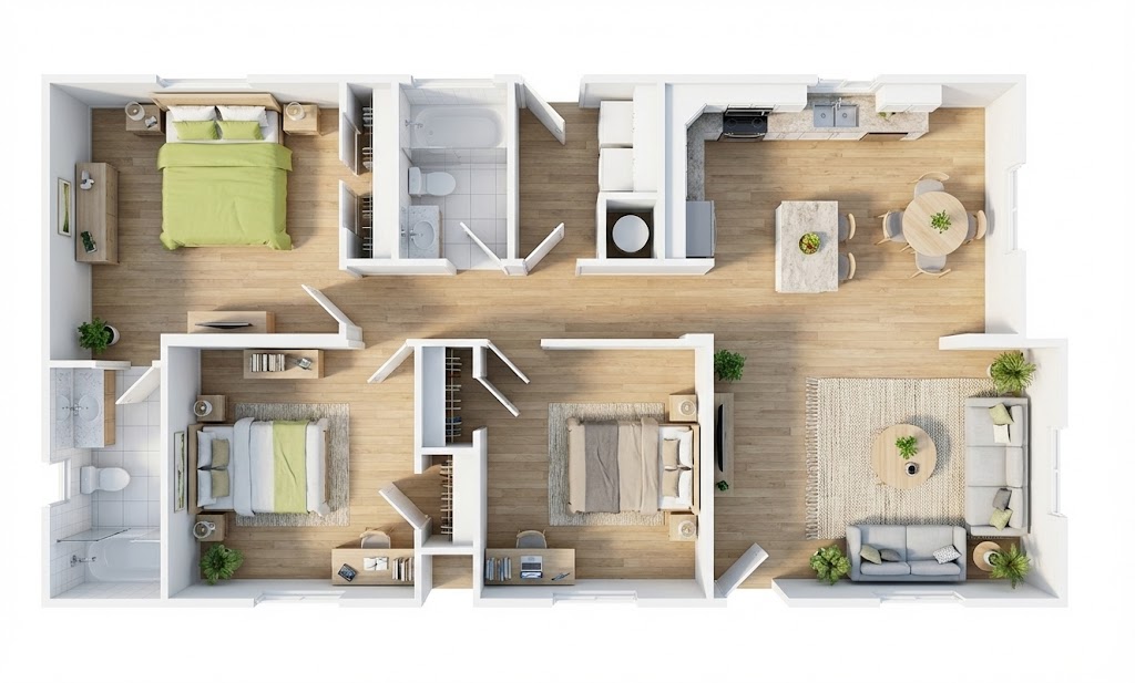 Note: Exterior images are conceptual renderings to highlight layouts and design possibilities. Siding, roofing, and porch details are customizable to your preference. Interior images depict a model showroom setting. We are equipped to tailor the interior design of any model to match your specific aesthetic.