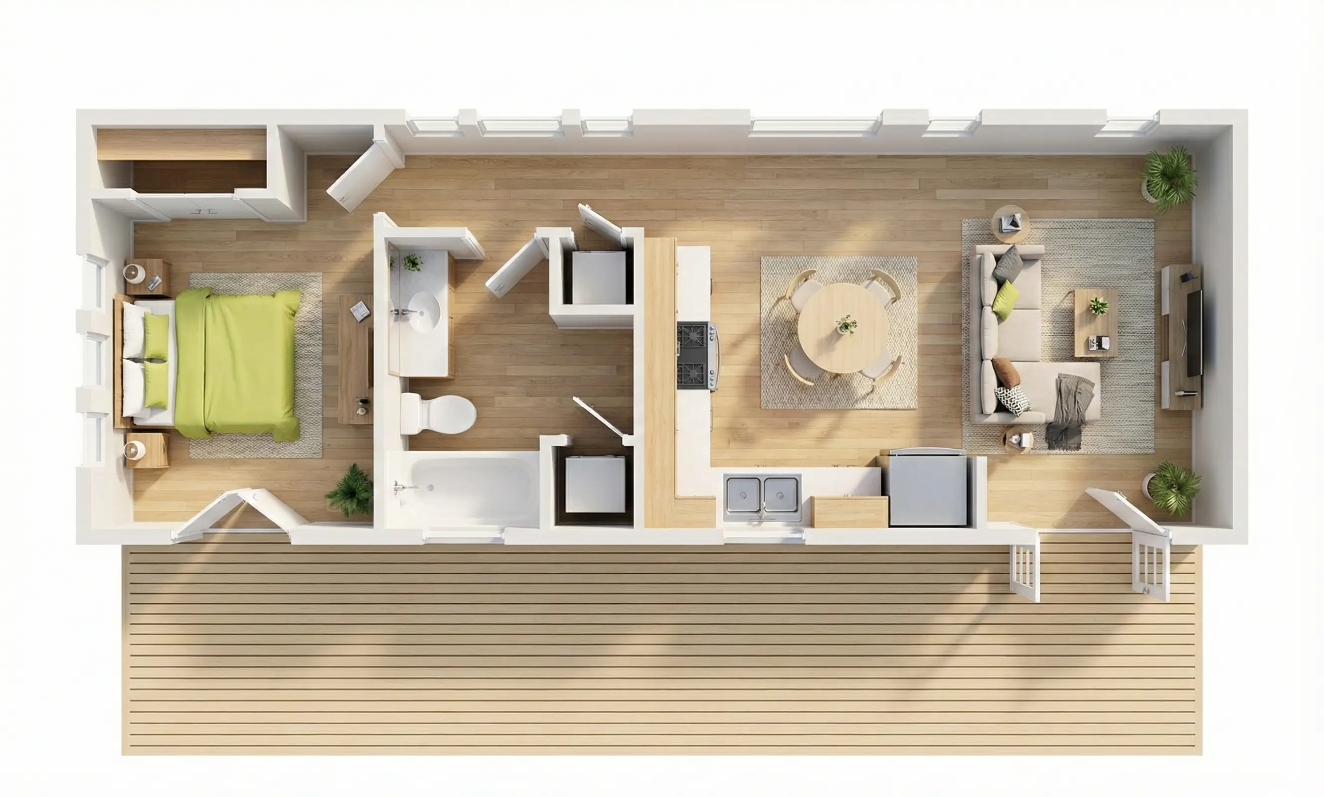 Please note: Exterior images are conceptual renderings to highlight layouts and design possibilities; siding, roofing, porch, and other details are customizable to your preference. Interior images depict a model showroom setting—we can tailor the interior design of any model to match your specific aesthetic.